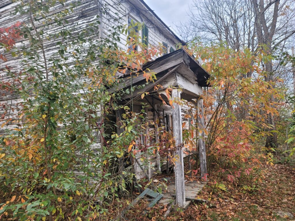 With the encroaching growth cleared away, the house emerged again — its true form revealed, along with the honest signs of age and the work yet to come. Note the Virginia Historical Marker in the front yard.
